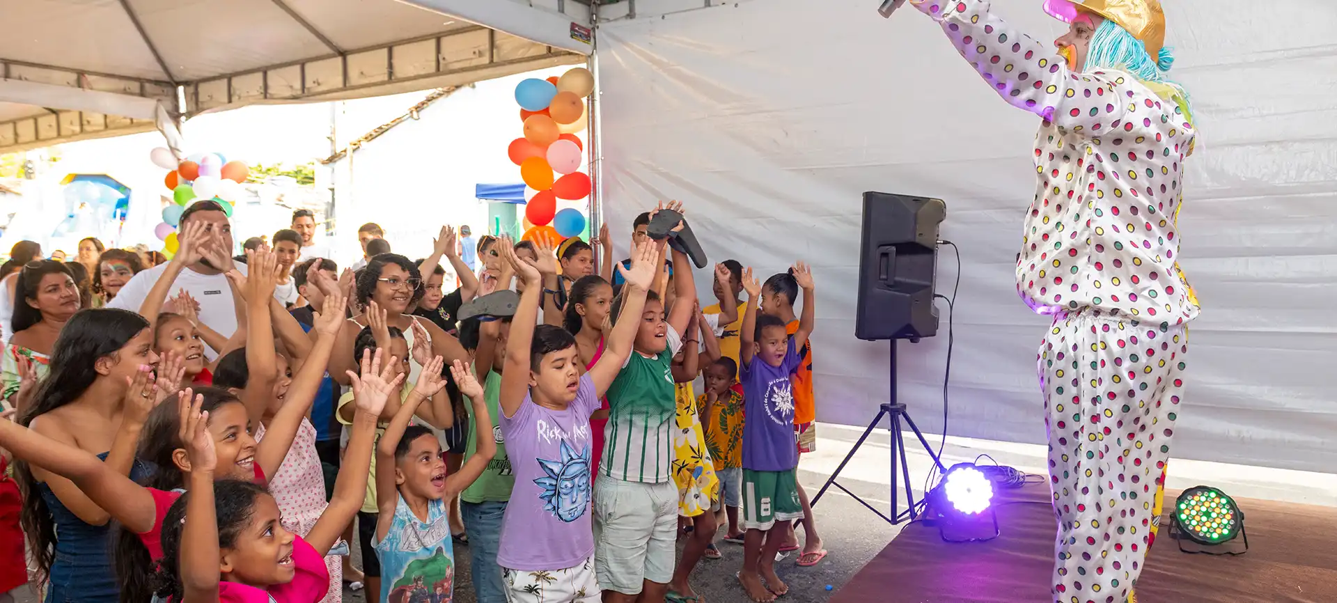 Maceió, 31 de outubro de 2025 - As crianças das comunidades de Chã de Bebedouro, Chã da Jaqueira e Vila Saem participaram, no último fim de semana, de uma Gincana Cultural. Em cada bairro, uma estrutura foi montada especialmente para o evento, que teve programação diversificada com brinquedos infláveis, animadores infantis, distribuição de lanches, entre outras. As atividades integram o segundo ciclo de oficinas do Programa de Apoio aos Grupos Culturais, realizado no âmbito do Plano de Ações Sociourbanísticas (PAS).
