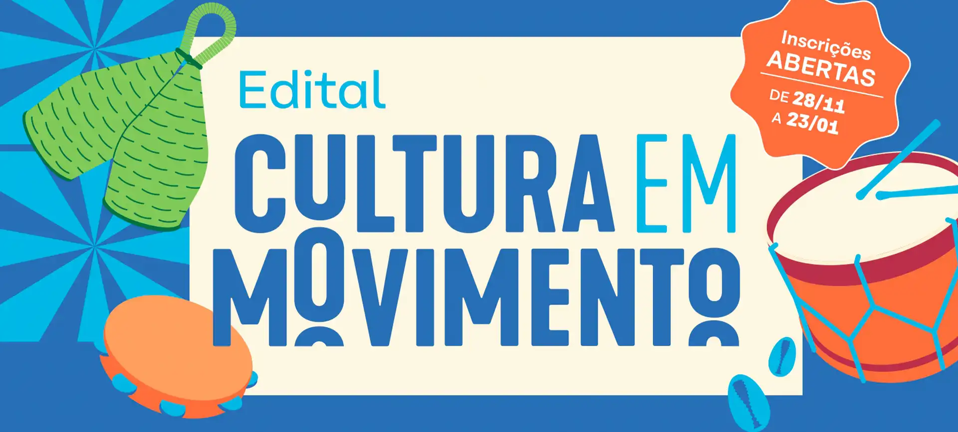 Maceió, 26 de novembro de 2025 - O Edital Cultura em Movimento estará com inscrições abertas, para grupos de Cultura Popular e Afro-Brasileira, a partir do dia 28 de novembro . A iniciativa contempla manifestações como Guerreiro, Pastoril, Bumba Meu Boi, Maracatu, Capoeira e Afoxé. Os interessados poderão se inscrever até o dia 23 de janeiro de 2026, através do site: www.editalculturaemmovimento.com.br