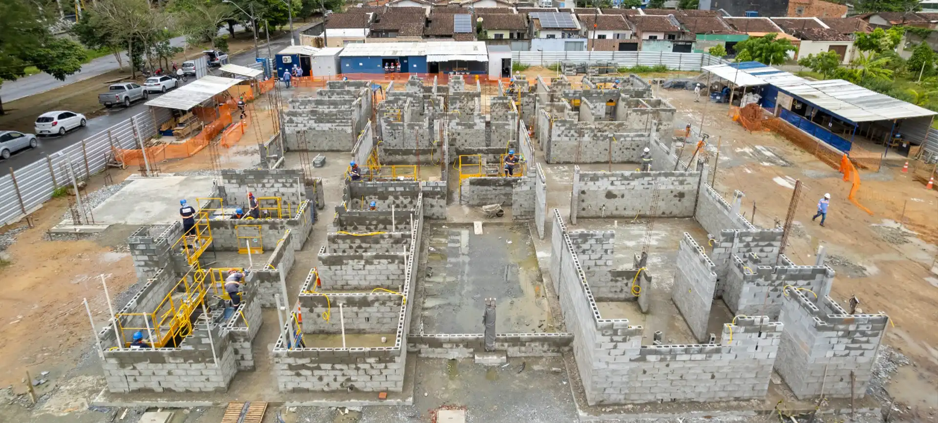 Com as fundações concluídas, o cronograma avança nas etapas de alvenaria, concretagem de pilares, instalação de ferragens, reservatórios de água, redes elétrica e hidráulica.