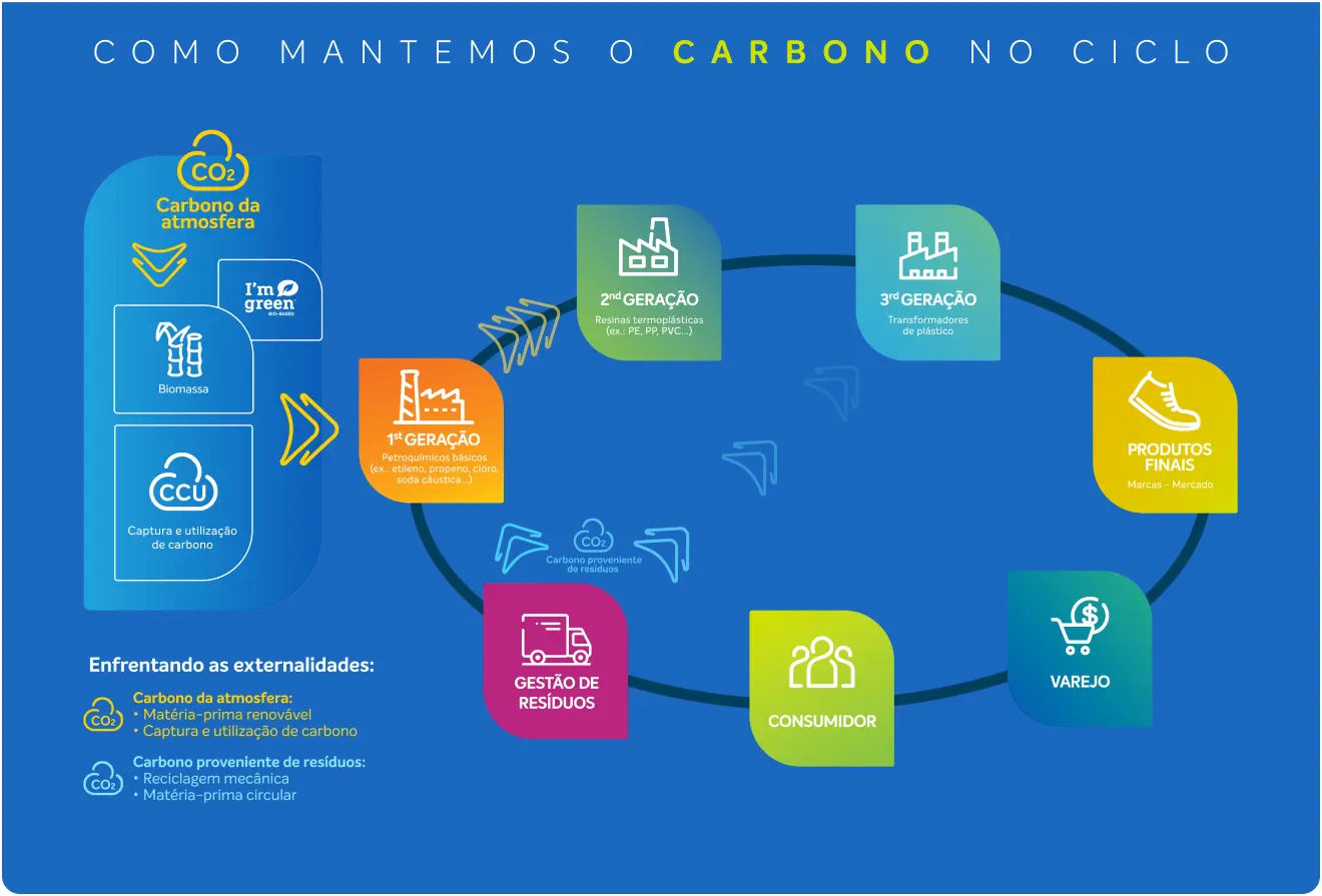 Por isso, o ecossistema de produtos e iniciativas sustentáveis da Braskem reúne nossos produtos e iniciativas para manter o carbono no ciclo por mais tempo, minimizando o impacto ambiental, promovendo uma cadeia de valor mais responsável e criando valor para empresas e pessoas.